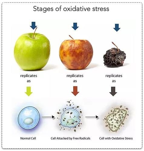 The dangers of oxidative stress are very real, and can be easily demonstrated with only a small amount of effort. One may simply leave a piece of fresh fruit out where it will be exposed to the air for a few months (you can dramatically speed this process up by cutting the fruit in half) to observe the effects of it in action. This process is whats happening inside of our bodies each and every day.